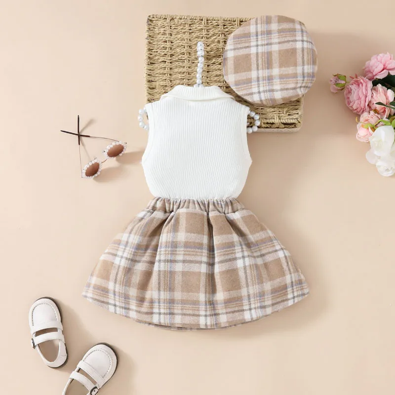 This stylish plaid skirt set is perfect for your fashion-forward little girl this summer. The sleeveless design keeps her cool and comfortable, while the classic beret adds a touch of sophistication. Show off her style with this adorable plaid set.